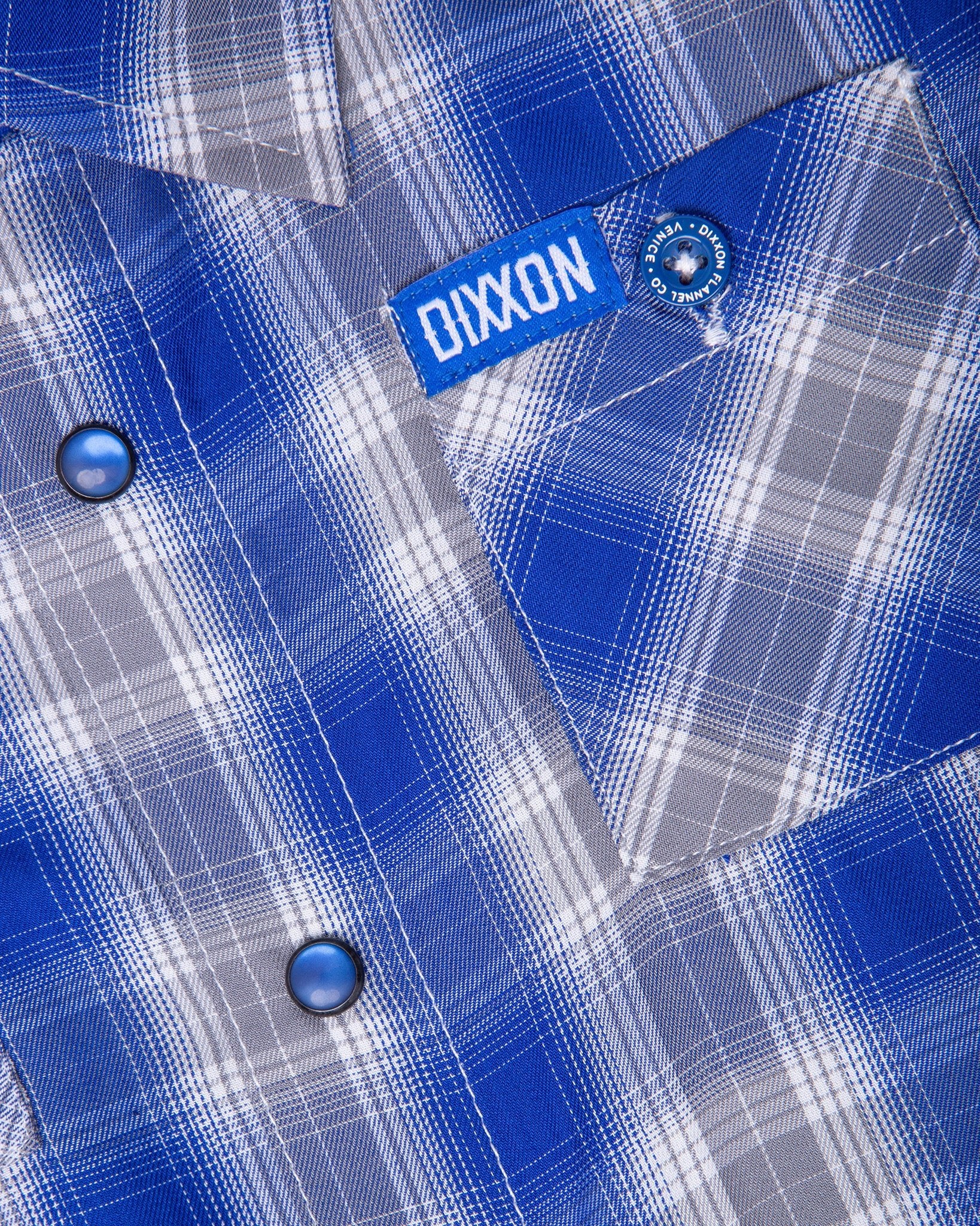 - Blue and white Dixxon brand tag on the left chest pocket